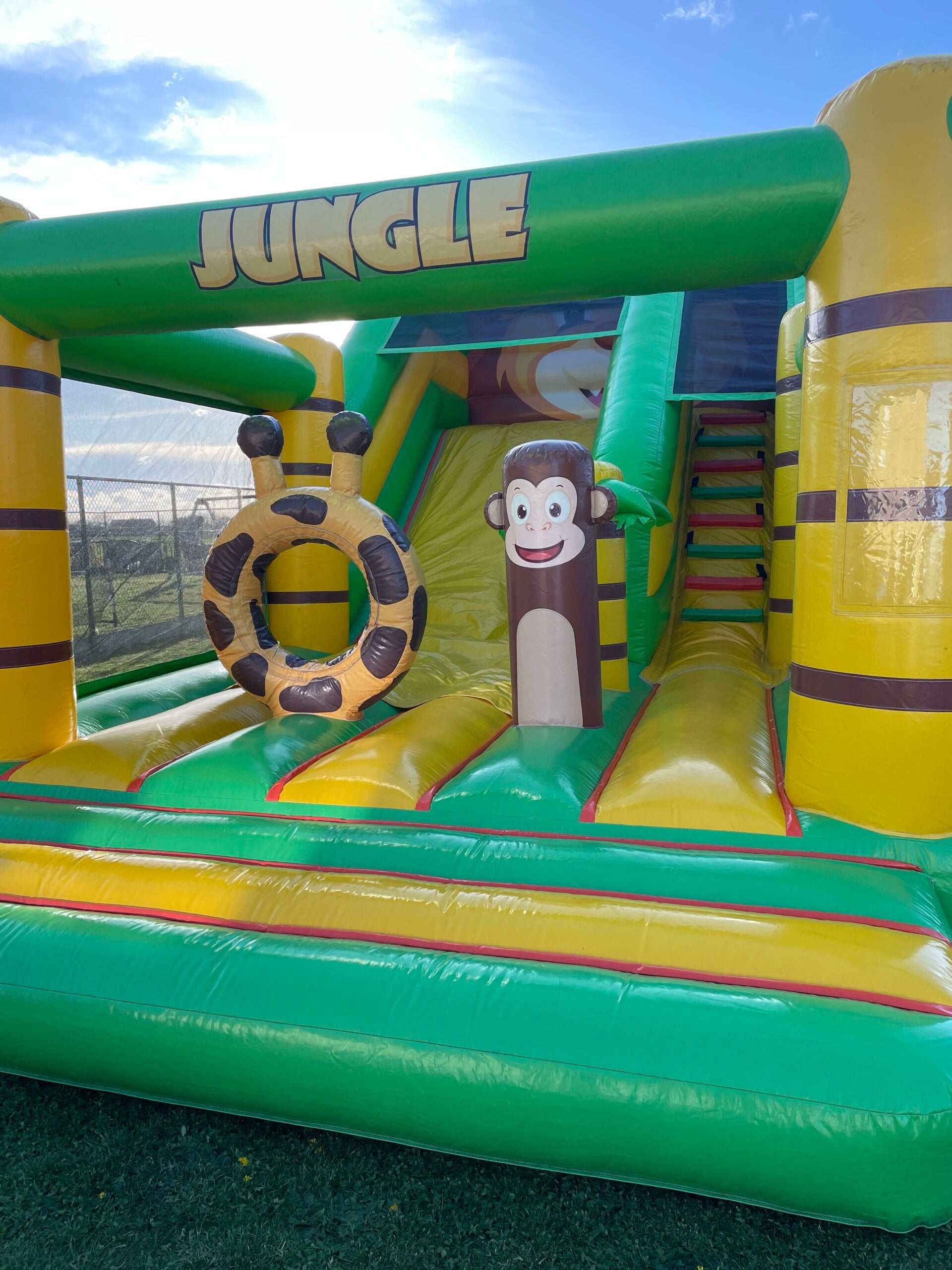 Zie hier onze Multi Slide Jungle. Met dit springkasteel met grote glijbaan weet je zeker dat je een leuke dag tegemoet gaat, want urenlang glijden en spelen, samen met je vriendjes en vriendinnetjes, hoe leuk is dat?! Baan jezelf een weg door deze opblaasbare jungle. En pas op voor de leeuw! Die ziet je maar wat graag naar beneden roetsjen.